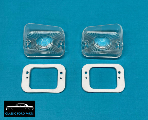 New pair of front bumper indicator lenses with gaskets for Ford Falcon XR, XT, and GT models, plus Ford Fairlane ZA, ZB, ZC, and ZD. This complete kit includes both lenses and gaskets for a proper seal and professional installation.